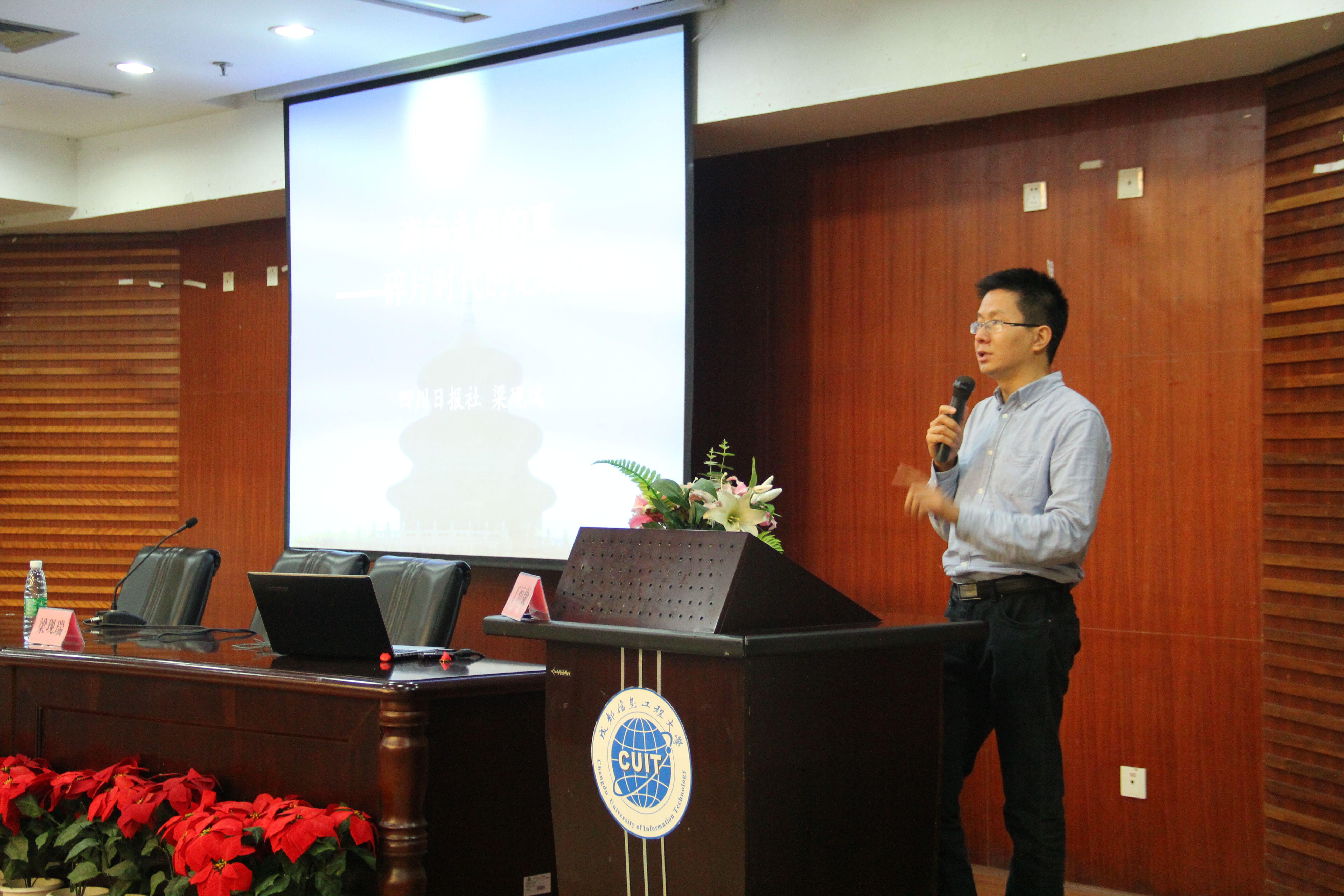 【本网讯】10月14日,由江南买球宣传统战部主办、新媒体联盟承办的“CUIT校媒菁英汇”系列培训第一场活动在航空港校区学术报告厅举行,本次讲座邀请到《四川日报》的首席记者梁现瑞老师作题为“巨变时代的记者生存”讲座。学校各部门、学院教师代表,校报记者团、新媒体学生代表、各学院学生代表等参加讲座。