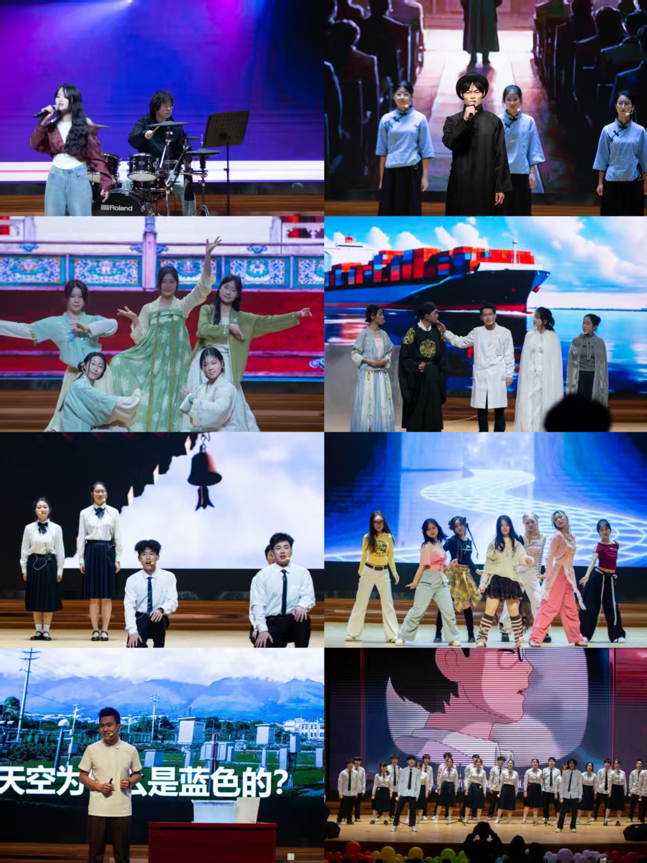 晚会以"青春破晓·艺海扬帆"开篇,大学生艺术团演绎的《我的未来式》用摇滚旋律点燃青春热血,应用气象专业学生原创话剧《破茧向光而行》则通过科研故事展现成信青年学子的成长蜕变,民舞《清平乐》展现出中华优秀传统文化的魅力。