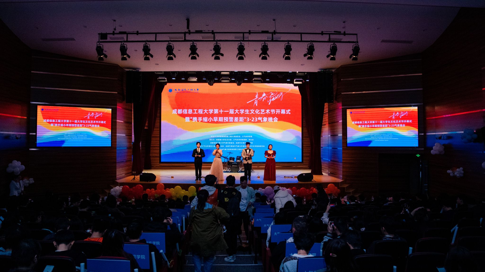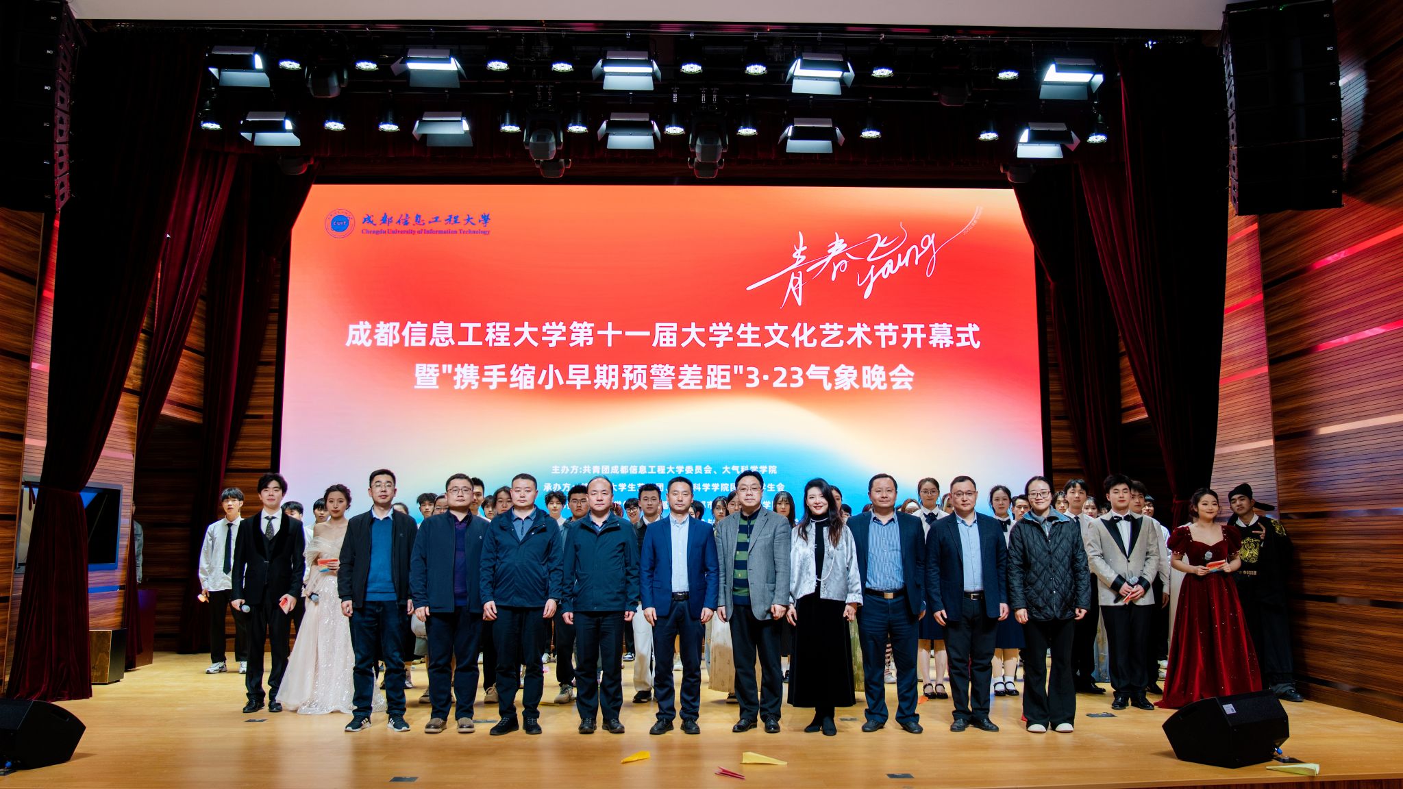【本网讯】3月23日,学校第十一届大学生文化艺术节开幕式暨“携手缩小早期预警差距”3·23气象晚会在航空港校区成信礼堂举行。学校副校长陈权亮,党政办公室、党委宣传部、党委学生工作部、研究生院、校团委、大气科学学院负责人,各学院团委书记及四百余名师生代表到场参加活动。