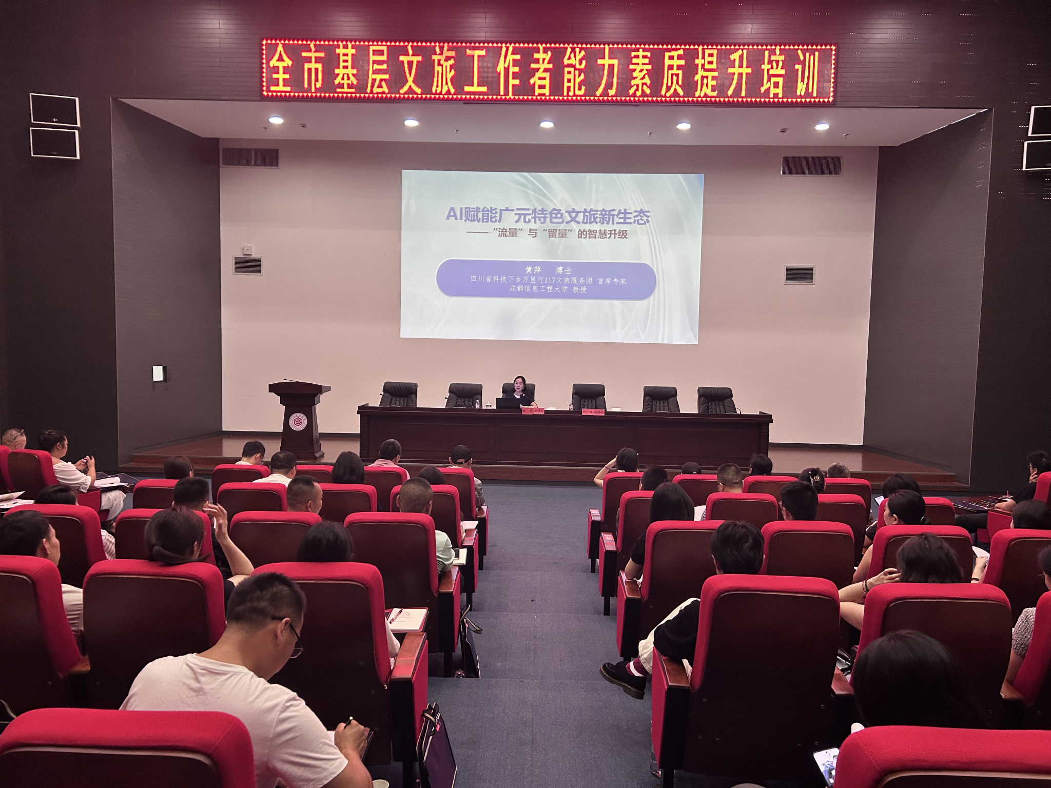 此次活动依托广元市文化广播电视和旅游局举办的“全市基层文旅工作者能力素质提升培训班”,面向全市120余名文旅系统骨干、乡村旅游带头人等开展授课。黄萍教授以《AI赋能广元特色文旅新生态》为题,结合剑门关、女皇故里等当地文旅名片,详解人工智能在文旅场景、产品及品牌推广中的应用路径,提出构建“科技+文旅+生态+康养”融合发展新模式。