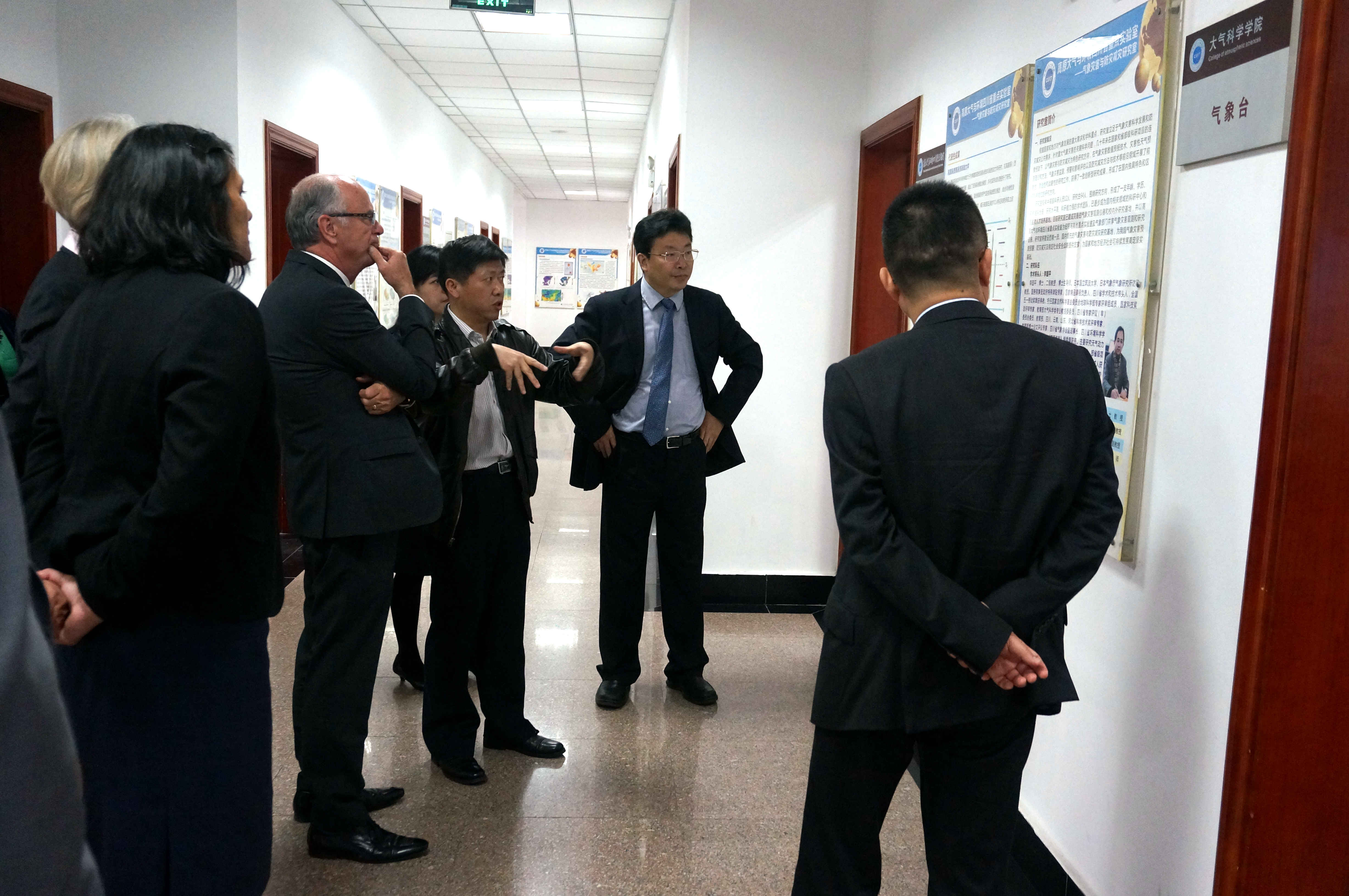 会后,为了使来宾对我院学科特色与科研情况有更直观、更全面的了解,周激流陪同来宾先后走访了气象学科群及信息学科群。大气科学学院副院长周筠珺及电子工程学院(大气探测学院)文继国老师所做的详实介绍使来宾对我院传统优势学科留下深刻印象,特别是Mark校长对我院青藏高原气候的研究表现出极大兴趣。随后计算机学院副院长吴锡向来宾详细介绍并展示了我院信息学科群优秀科研成果及自主研发产品,让来宾对我院信息类学科相关研究走在了世界前沿有了充分认识。Mark校长一行参观完后纷纷表示,我院的相关科研能力与成就十分出色,非常希望通过与我院建立合作关系,在相关学科专业上获得我院的帮助,并邀请周激流再次访问新西兰。陪同参观的还有大气科学学院党总支书记张小红、党总支副书记繆燕平、副院长陈权亮、电子工程学院(大气探测学院)副院长杨玲、副院长马尚昌等。