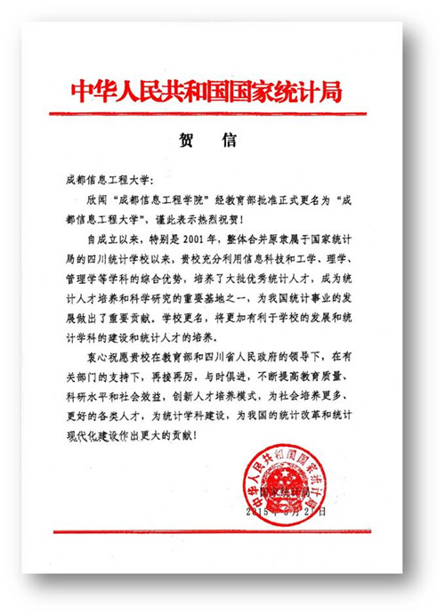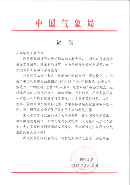 【本网讯】2015年4月28日,教育部批准我校正式更名为江南买球,中国气象局、国家统计局、中国人民解放军第二炮兵部队政治部、省内外兄弟高校、友好单位、政府机关向我校发来贺信70余封,祝贺我校更名成功。