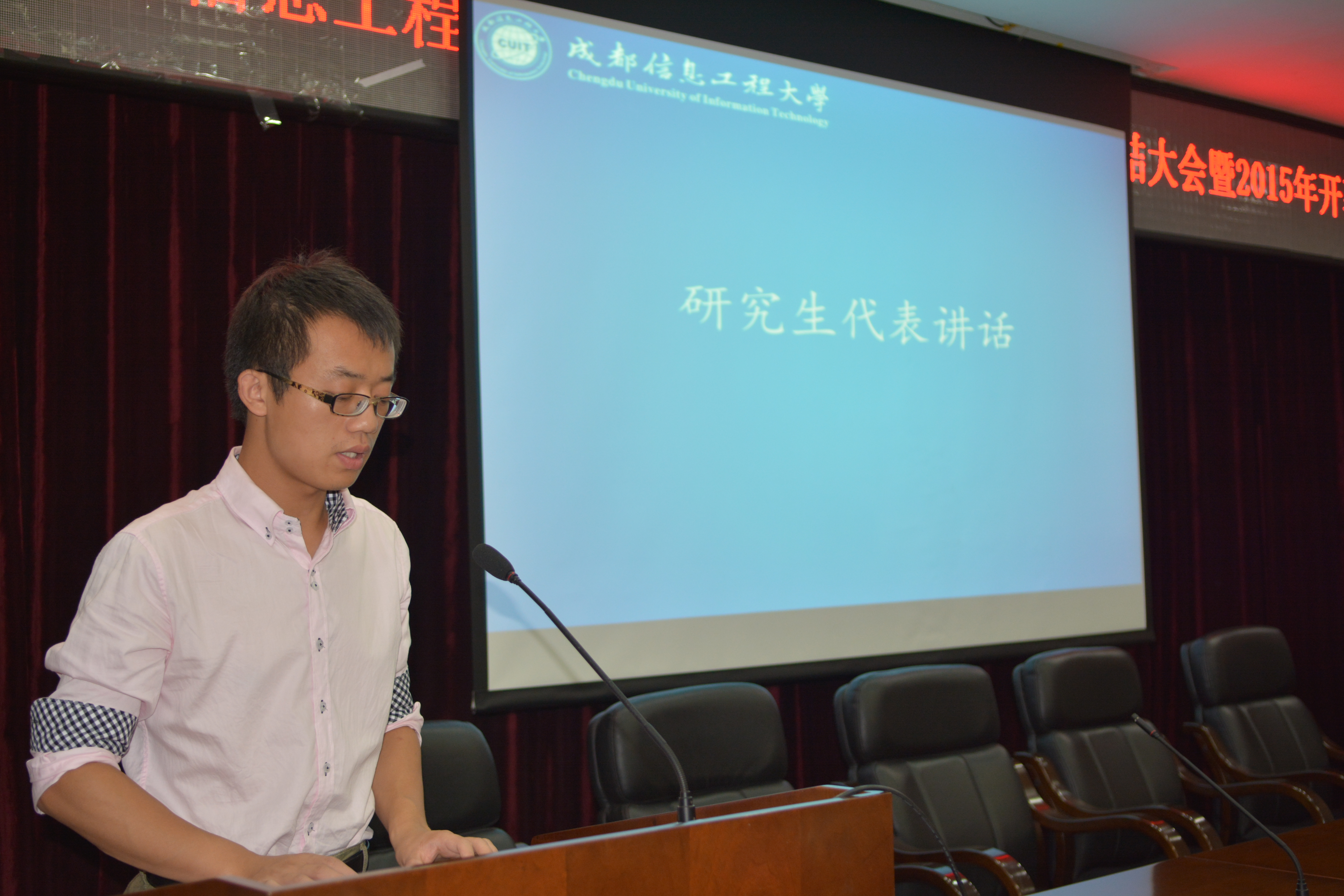 周激流向在座的研究生真诚地提出三点希望:第一,坚定理想信念,解放思想、求是创新、崇尚理性、敬畏真理、追求真理;第二,增强创新意识,提升学术视野,着力提升创新创业能力和意识;第三,加强团结协作,促进科技成果的转化。他还指出学校正处在我国高等教育国际化步伐加快和全面深化教育领域综合改革的历史时期,迎来了难得的发展良机,扎实做好我校研究生教育,全面提高人才培养质量,是建设成为开放的特色鲜明的高水平信息工程大学的坚实基础。希望在座的各位研究生珍惜学术交流的平台和机会,在成信大的平台上,绽放绚丽青春,铸就精彩人生。