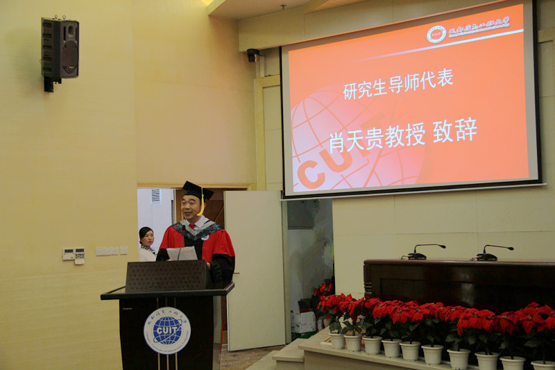 肖天贵教授代表全体毕业生导师祝贺2015届毕业研究生圆满完成学业。他说,回顾同学们三年的研究生学习生涯,同学们获得了知识、获得了友情、也收获了爱情。也许同学们在学校里还是有茫然、有失落,但青春为伴的奋斗画卷将永远流淌在心间,灌溉着日后的求学生活和工作生活。他鼓励毕业生们:对自己的要求有多高,人生的高度就有多高,相信自己,勇攀高峰,并祝愿同学们的未来灿烂辉煌!