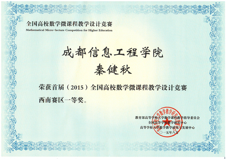 【本网讯】2015年8月,我校应用数学学院4位教师在教育部高等学校大学数学课程教学指导委员会和全国高等学校教学研究中心共同主办的首届“全国高校数学微课程教学设计竞赛”中取得了优异成绩,喜获西南赛区一等奖1项和二等奖1项。