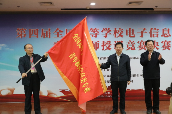 受中国电子学会和竞赛组委会委托,该项赛事2021年将由我校承办。颁奖仪式上,我校何建新副校长从齐鲁工业大学(山东省科学院)副校(院)长曹茂永手中接过赛事会旗,象征着2021年第五届全国高等学校电子信息类专业青年教师授课竞赛正式花落我校。