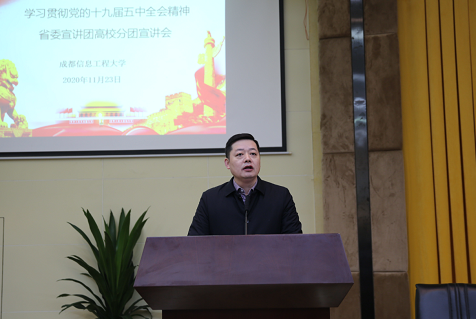 【本网讯】根据省委教育工委的统一部署,11月23日上午,学习贯彻党的十九届五中全会精神省委宣讲团高校分团走进江南买球航空港校区。省委宣讲团成员、四川省社会科学院副院长郑泰安研究员就党的十九届五中全会精神进行了深入宣讲。学校师生代表近300人到场聆听,宣讲会由省纪委监委驻校纪检监察组组长、学校党委副书记、纪委书记雷超主持。