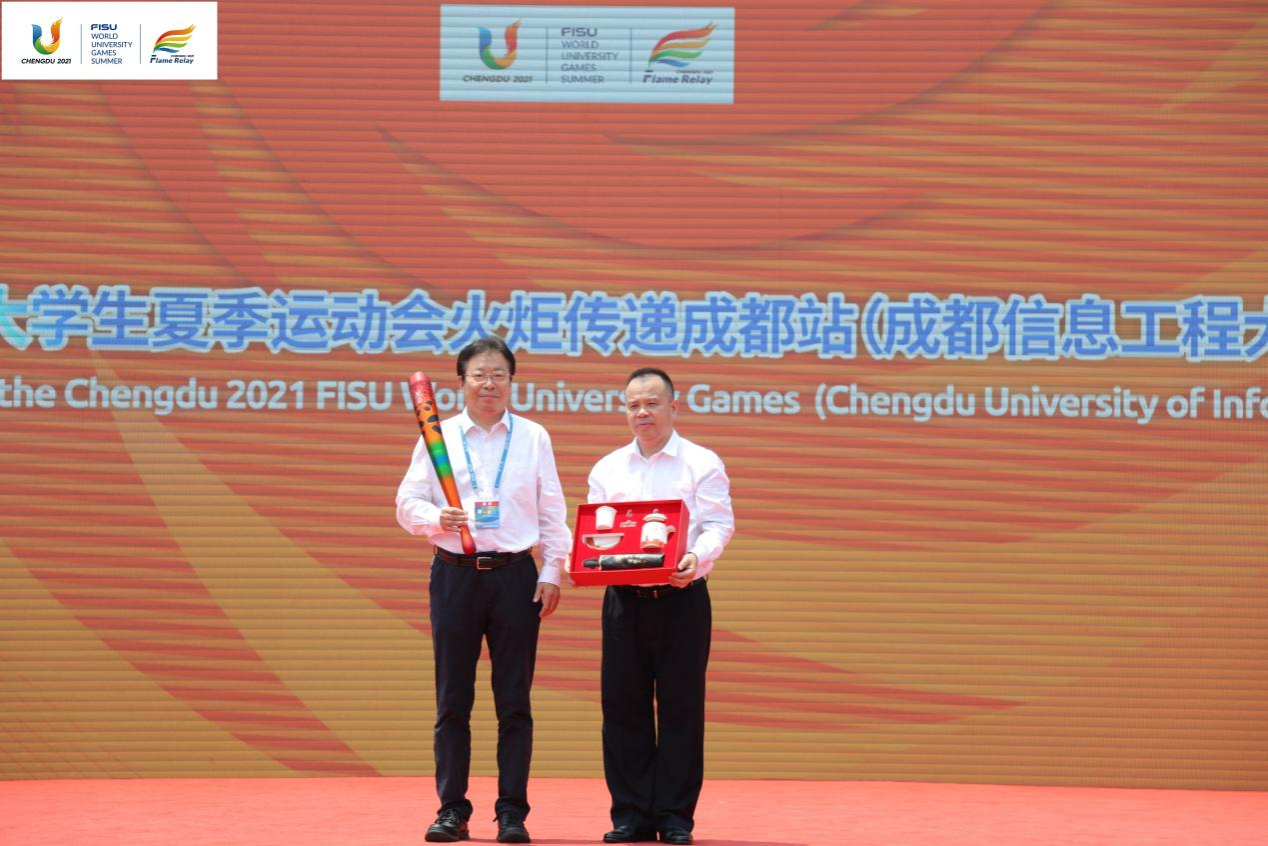 何建新主持火炬收火仪式。中共成都市委常委、政法委书记,成都大运会执委会副主席陈麟分别与四川师范大学党委副书记、校长汪明义,成都航空职业技术学院党委书记陈小红,四川旅游学院党委副书记、校长卢一,我校党委书记周激流相互赠送精美纪念品。