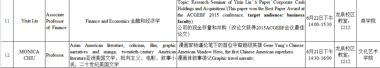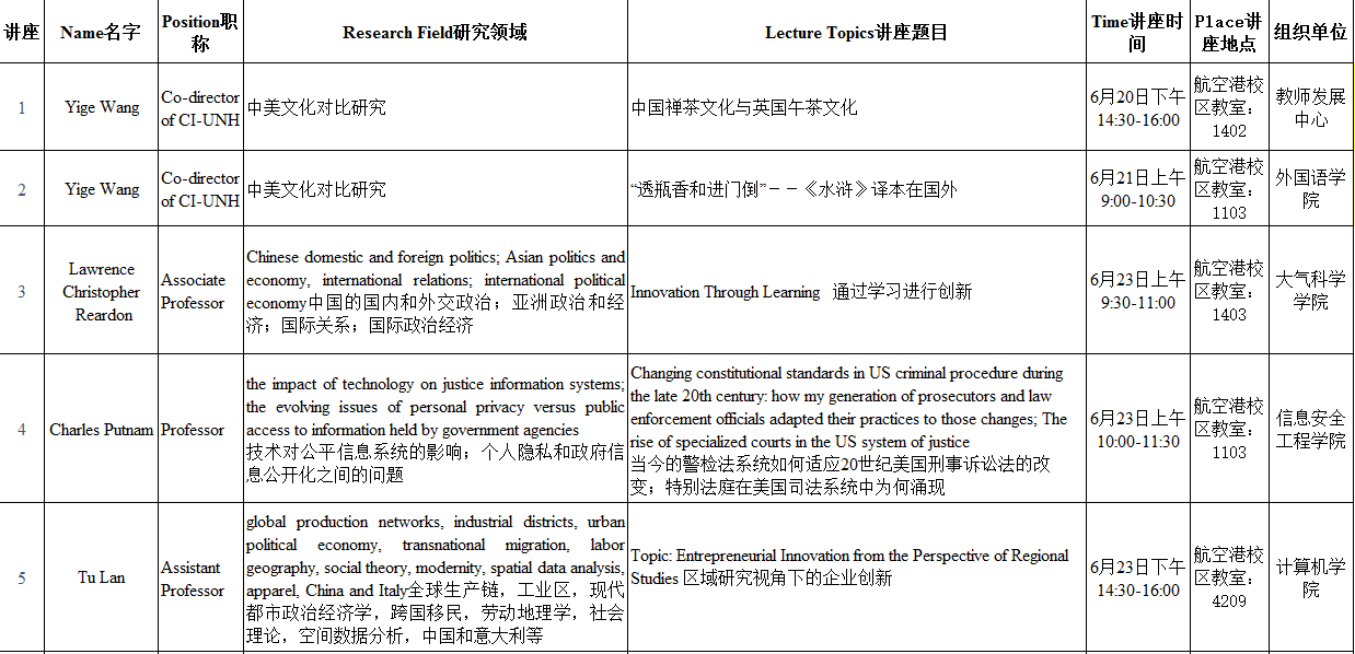 来自美国新罕布什尔大学的教授一行,将于6月20日至6月24日在我校开展12场讲座,时间和地点安排如下: