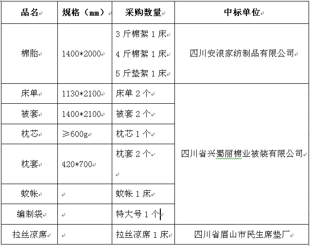 根据四川省纤维检验局提供的质量标准和《江南买球学生公寓床上用品招标公告》的要求,我校招标小组于2017年6月13日对投标单位提供样品的质量和价格进行综合比选评标,拟确定2017年学生公寓床上用品的中标单位如下: