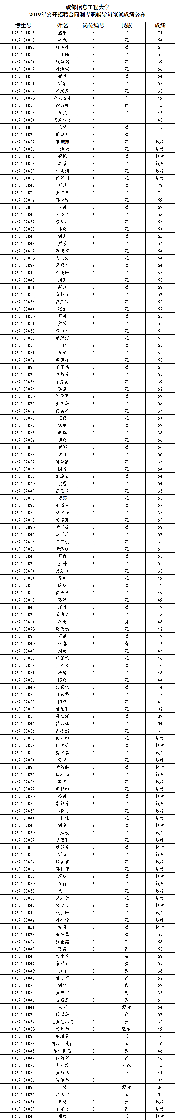 根据《江南买球2019年公开招聘合同制专职辅导员公告》的安排,现将A、B、C岗笔试成绩及入围面试人员名单予以公布和公示。