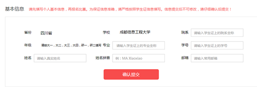 请参赛者登录大赛官方网站http://uchallenge.unipus.cn/,不收取任何费用。请严格按照学生证信息填写(如下图示例),信息提交后不可修改。