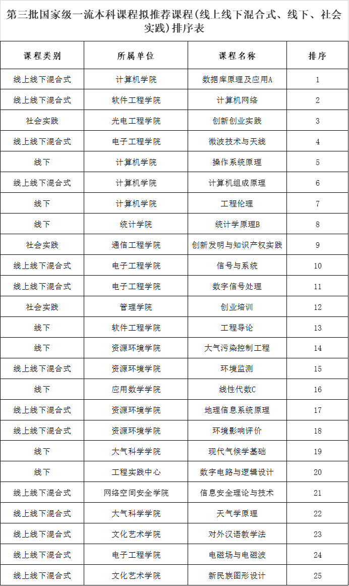 根据《教育部办公厅关于开展第三批国家级一流本科课程认定工作的通知》(教高厅函〔2023〕24号)、《四川省教育厅关于开展第三批国家级一流本科课程和省级线上一流本科课程申报推荐工作的通知》(川教函〔2023〕483号)文件要求,通过各单位推荐及专家评审,现将评审推荐排序结果公示如下表。
