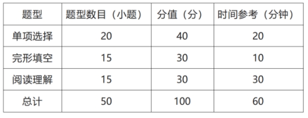 满分为100分,时间为60分钟,共3种题型50道题,全部为客观题。参赛选手不得使用任何纸质词典、电子词典和工具书。