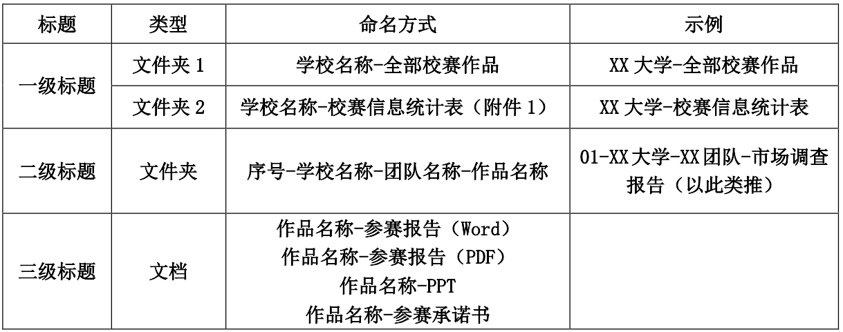 202432612:00前,各校参赛负责人(或联系人)向省赛组委会提交校赛信息统计表(附件1)、校赛全部团队作品、参赛承诺书至省赛组委会邮箱:383643116@qq.com,请以学校名称命名压缩包发送,组委会予以审核、确认各校省赛团队名额。邮件请注明主题“某某学校研究生组最终全部校赛作品文件”,具体文件夹及作品命名要求见下表: