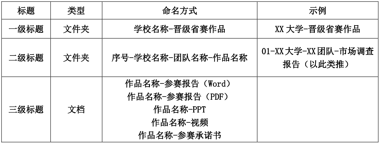 考虑省赛初赛规模大,提交的竞赛材料多,竞赛系统有可能出现操作异常情况,建议网上提交竞赛材料的同时,另通过邮件方式提交至省赛组委会指定邮箱。邮件请注明主题“某某学校晋级省赛作品文件”,具体文件夹及作品命名要求见下表: