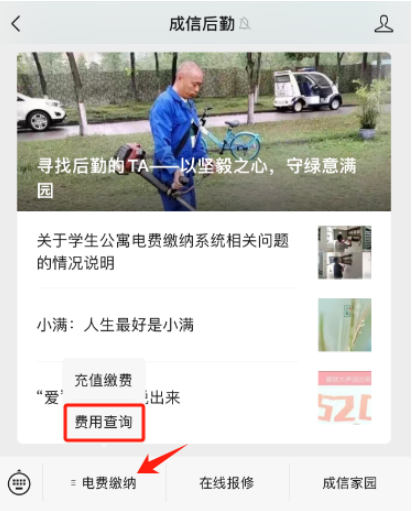 第一步:进入“成信后勤”微信公众号页面,点击电费缴纳-费用查询