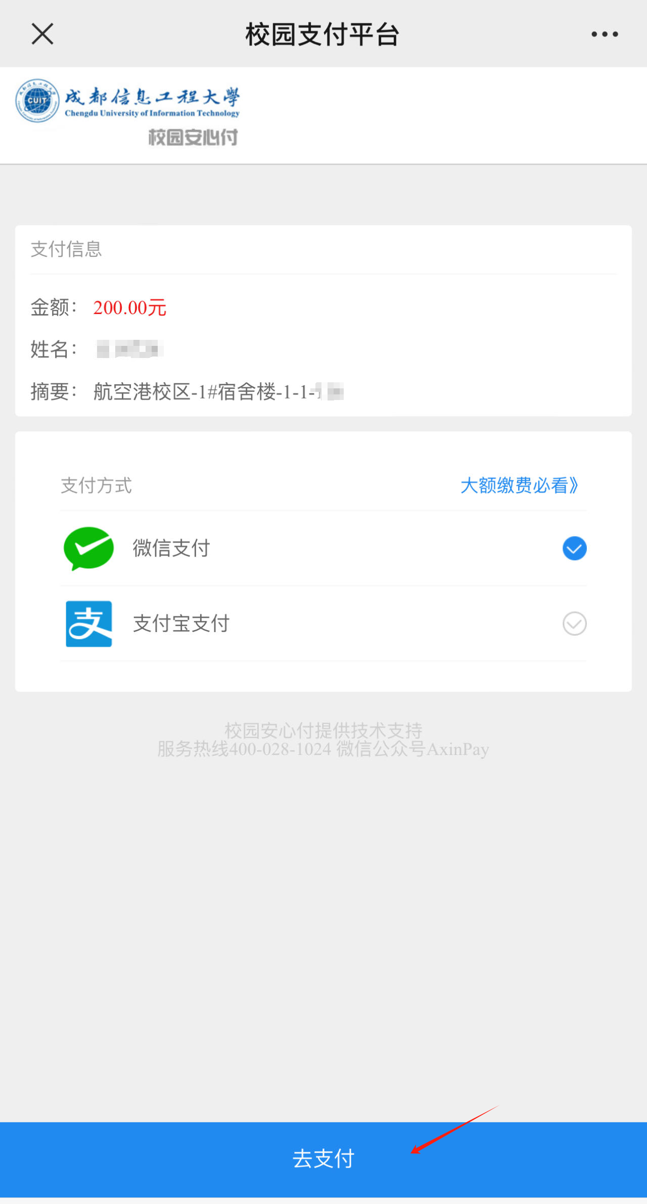 第六步:进入校园安心付支付平台页面,点击去支付,完成缴费