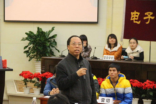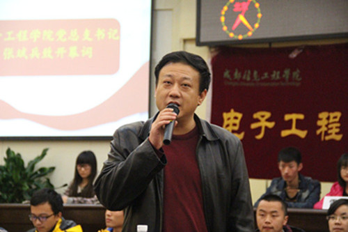 【本网讯】12月2日晚,由共青团成都信息工程学院委员会和电子工程学院主办,温州市共好防雷(智能)科技有限公司和浙江雷泰电气有限公司承办的第八届雷电科学知识竞赛“共好雷泰”杯决赛在国际会议厅顺利举行。电子工程学院党总支书记张斌兵,副书记彭勇,校团委副书记马义华,成都华云科雷电子科技有限公司总经理郭在华,雷电教研室主任孙秀斌,以及雷电专业老师和电子工程学院各位辅导员受邀担任本次比赛的嘉宾。