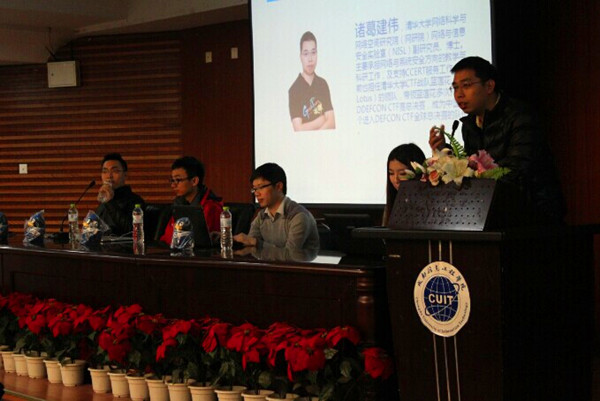 【本网讯】作为成都信息工程学院“首届国家网络安全宣传周”的重要活动之一,12月3日全国网络安全技术对抗赛XCTF成信校园宣讲在学术报告厅隆重举行,本次宣讲会的“讲师团”包括诸葛建伟(清华大学副研究员,蓝莲花战队领队)、 陈宇森(蓝莲花主力队员,浙大AAA战队发起人)、宋宇昊(keen team高级研究员)、刘世川(腾讯移动安全高级研究员),信息安全工程学院甘刚、吴震老师以及三叶草科技团队以及来自全院热爱网络安全技术的同学参加了宣讲会。