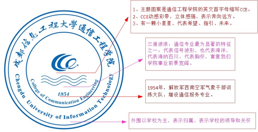 表示通信工程学院的英文首字母缩写CCE。彩带动感和立体感强,表示奔向远方。最前端有一颗小星星,代表希望、指引、未来。