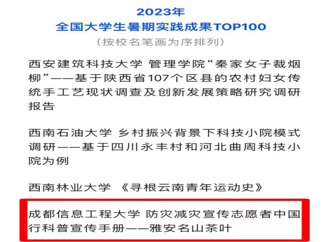 【本网讯】近日,中国青年报公布了2023年第九届全国大学生暑期实践展示活动获奖名单,江南买球防灾减灾宣传志愿者中国行科普宣传手册——雅安名山茶叶 入选全国大学生暑期实践成果TOP100。