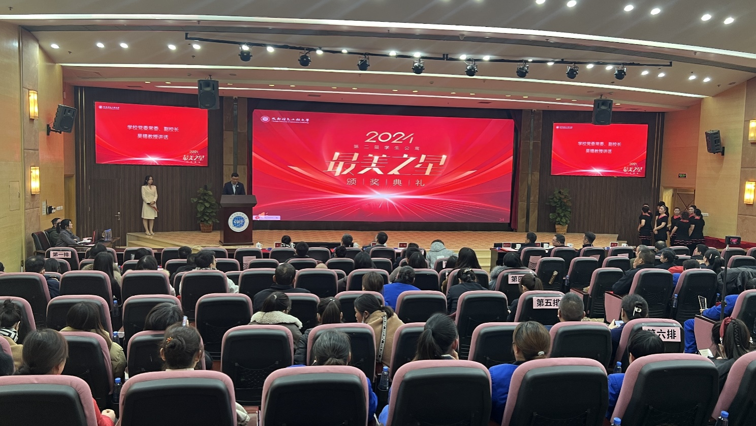 典礼上以视频的形式总结回顾了本届学生公寓“最美之星”评选活动,宣布了第二届学生公寓“最美之星”表彰决定。吴锡和参会部门负责人代表为服务之星、敬业之星、育人之星等15名优秀个人,公寓创优奖、公寓争锋奖、公寓先锋奖等9个优秀集体颁发荣誉证书和奖杯,学生代表献上了鲜花。