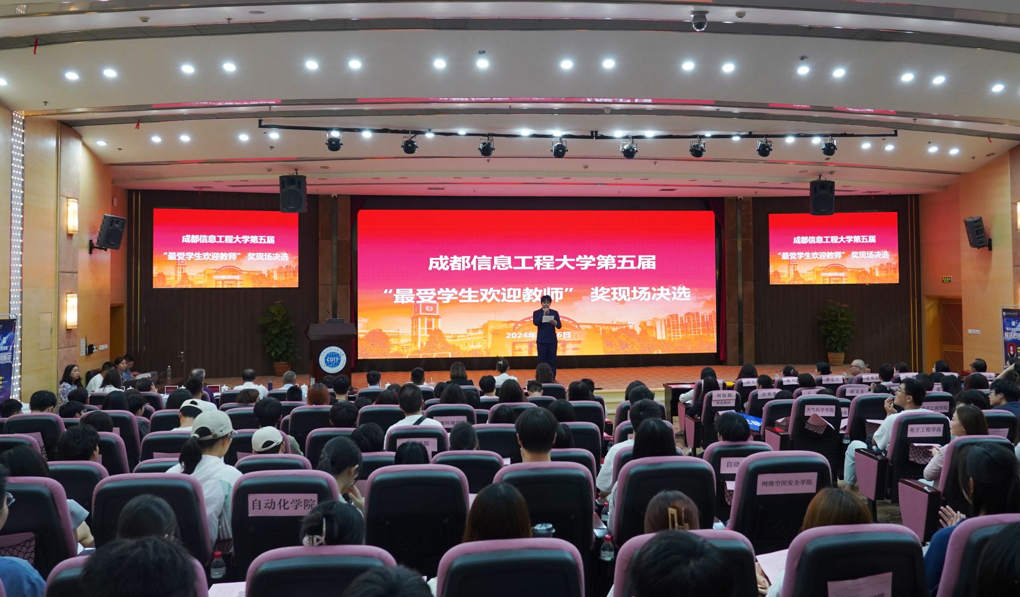 【本网讯】5月16日下午,第五届“最受学生欢迎教师”奖现场决选在航空港校区国际会议厅举行。学校党委宣传部、党委教师工作部、党委学生工作部、校团委、教学评估中心、教务处等职能部门和教学单位负责人、候选教师、各学院学生代表、纪委办公室工作人员等参加了本次评选会。