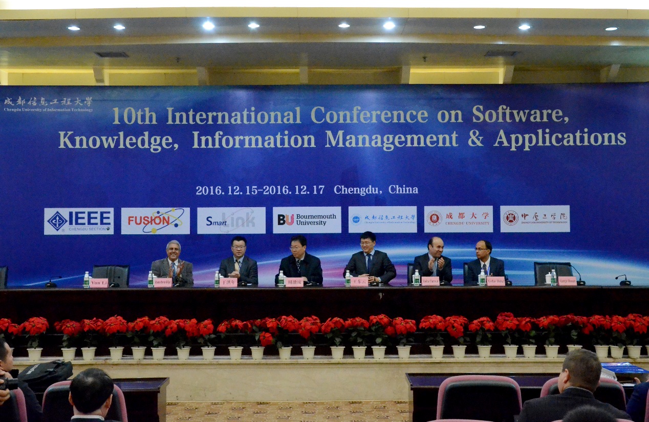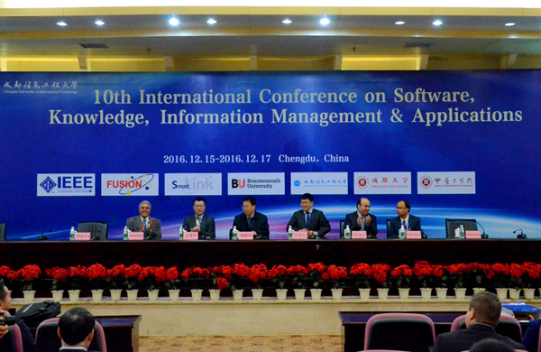 【本网讯】由欧盟FUSION PROJECT项目主办,我校承办的第十届国际软件、知识、信息管理及应用会议(International Conference on Software, Knowledge, Information Management and Applications–SKIMA)于12月15日上午九点在我校国际会议厅隆重开幕。SKIMA国际会议组织委员会主席周激流教授、王东云教授、于洪年教授、Keshav Dahal教授以及来自 14个国家的专家、学者等共200余人参加了开幕式。开幕式由计算机学院院长何嘉教授主持。