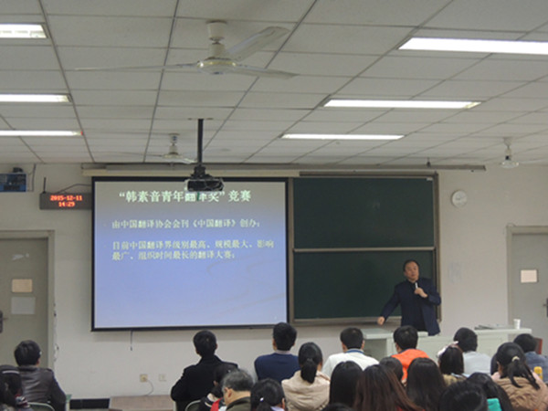 【本网讯】12月11日下午,林巍教授在第二教学楼2208教室为广大师生带来了一场题为“韩素音青年翻译奖”的讲座。讲座由外国语学院院长康莲萍主持。