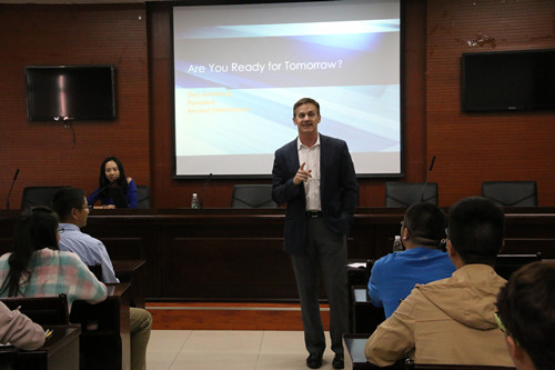 【本网讯】4月5日下午,领升国际CEO Guy Armstrong 的团队成员Bill Catchings、 Haley chitty 、Amy Henderson等8位专家应我校国际交流合作处和管理学院邀请,以他们丰富的外企阅历以及职场经验,为我校师生带来一场职业生涯规划的讲座。