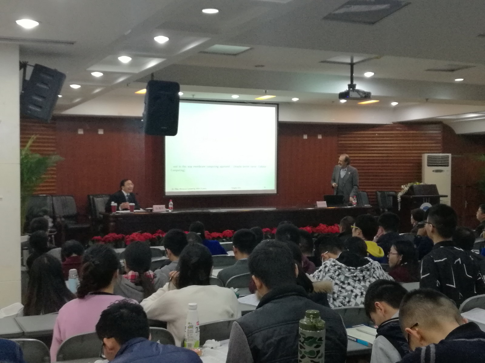 GheorghePăun院士深入浅出地介绍了自然计算的发展历程和基本原理、自然计算中DNA计算的主要原理和局限性,回顾了18年来膜计算的提出以及在理论和应用方面取得的研究成果,引起了师生们对智能计算的极大兴趣。