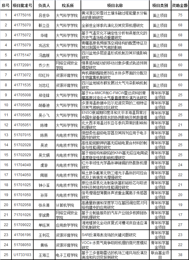 按项目类型统计,有面上项目8项,青年项目16项,联合基金项目1项。按学院统计,大气科学学院9项,光电技术学院7项,资源环境学院4项,网络空间安全学院2项,电子工程学院、计算机学院、应用数学学院各1项。