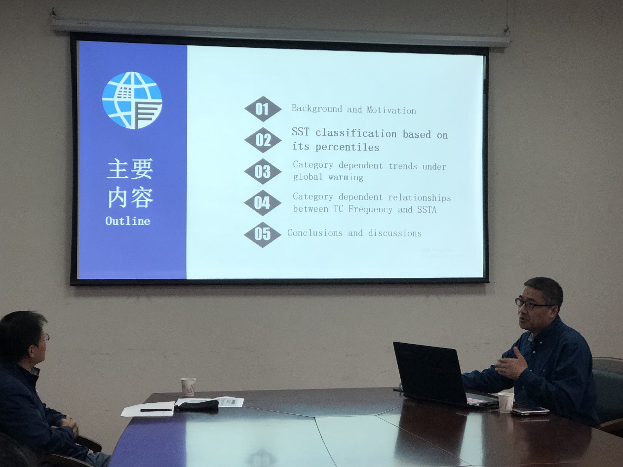 【本网讯】11月13日上午,广东省气象局首位海外领军人才、广东省区域数值天气预报重点实验室科学主任张邦林博士应大气科学学院邀请,在气象楼310会议室作题为“Improved Hurricane/Typhoon Forecasts with Higher Vertical Resolution Models”与“Impact of Sea Surface Temperature on Changes of Tropical Cyclone Frequency under Global Warming”的报告。报告会由靳立亚教授主持,大气科学学院师生参加了讲座。