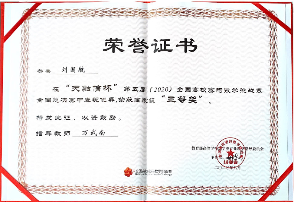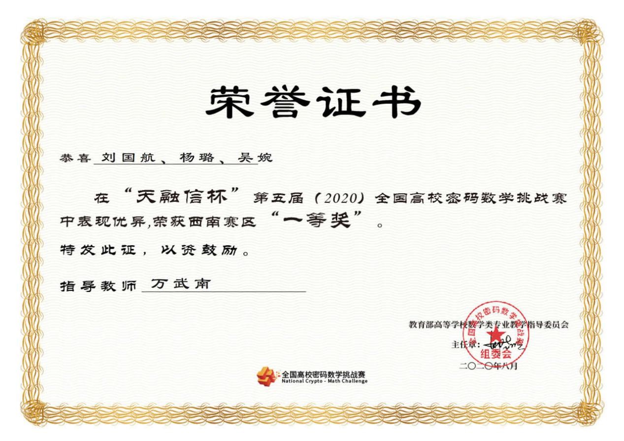 近日,由教育部高等学校数学类专业教学指导委员会、天融信科技集团联合主办的“天融信杯”第五届(2020)全国高校密码数学挑战赛总决赛圆满落幕。江南买球网络空间安全学院的“三只松鼠”战队荣获西南赛区一等奖、国家级三等奖。
