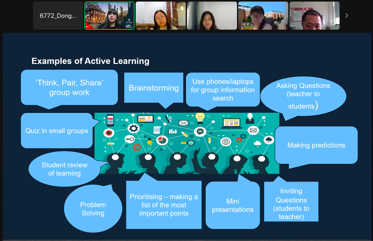 该项目为期两周(6月14日-23日),共8个项目主题,通过Zoom平台由阿德莱德大学教授在线进行直播授课。讲座内容涉及全英文教学法、翻转式学习法、高效课堂管理的探索与实践、有效利用社交软件及互动学习平台组织教学等内容。通过探讨清晰、精准授课的重要性,分析如何有效地运用教学词汇,积极引导教师思考高质量的提问如何能够充分发挥作用,并分享了教育工作者的反思式练习方法。