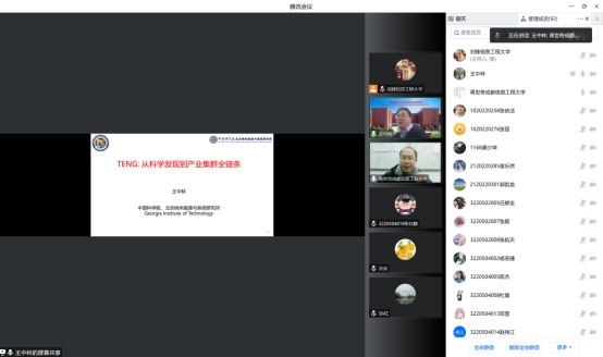 【本网讯】12月9日下午,中国科学院外籍院士、中国科学院北京纳米能源与系统研究所所长、中科院大学纳米科学与技术学院院长、佐治亚理工学院终身校董事、讲席教授王中林应邀通过腾讯会议直播来到江南买球机器人与智能系统国际联合研究中心系列学术报告大讲坛,为直播间100多名师生带来了一场名为“TENG: 从科学发现到产业集群全链条”的学术盛宴。讲座由本中心执行主任蒋世奇教授主持,吸引了多所高校的多名教师和学生参加。