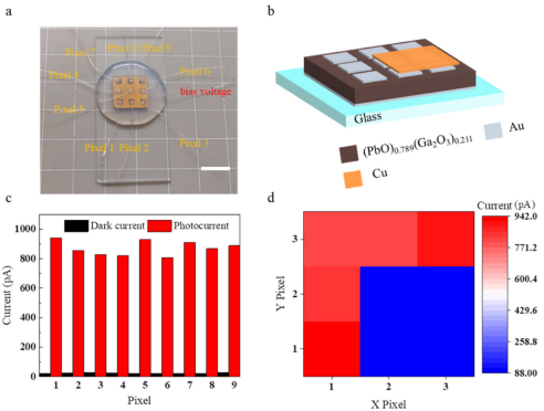 图1.基于全非晶态体(PbO)x(Ga2O3)1-x的整列X射线探测器以及测试结果