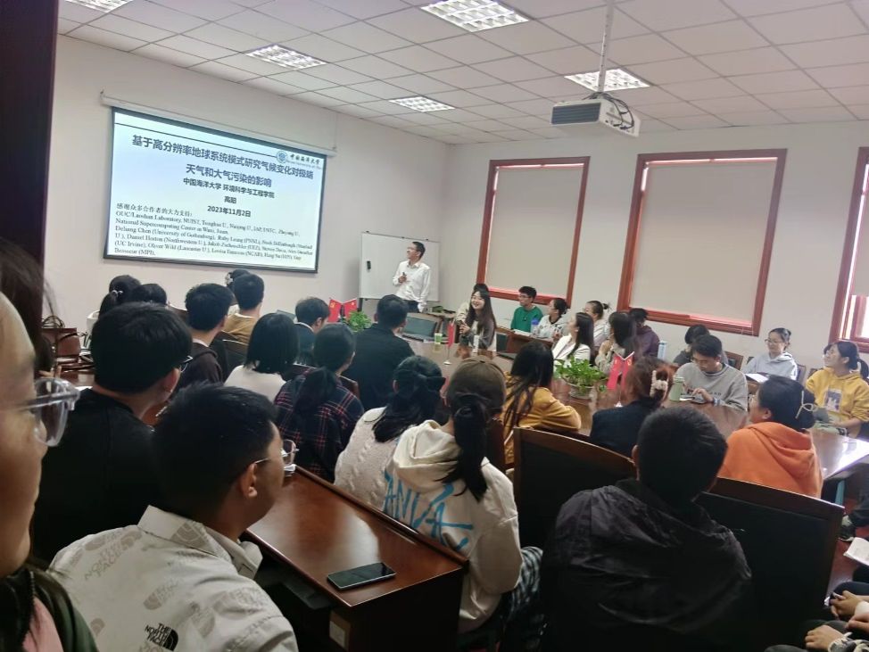 高阳教授就基于高分辨率地球系统模式中的涡热传输计算方法、臭氧、对海洋和大气热浪等极端天气事件和大气污染物的模拟效果等进行了口头报告。会后,张小玲教授等和在场的研究生们与高阳教授,就高分辨率资料在气候影响健康方面的应用、模式模拟预测新粒子生成的动力条件等当前领域热点问题,进行了深入的探讨。