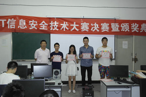 【本网讯】5月24日下午,由教务处和校团委主办,信息安全工程学院承办的第十一届信息安全技术大赛决赛暨颁奖典礼在6606教室举行。信息安全工程学院党总支书记许鸿涛,信息安全专业教研室主任吴春旺等六位老师出席了此次颁奖典礼。
