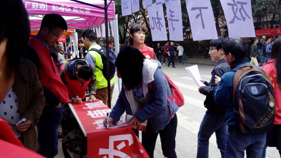 当天中午十二点,在青志协副会长范利梅的组织下,志愿者们对在校大学生开展了问卷调查及签名等活动。经调查分析,很多学生的近视都是由于大量使用手机造成的。志愿者们并于次日晚在中心花园播放了呼吁学生放下手机的宣传视频。