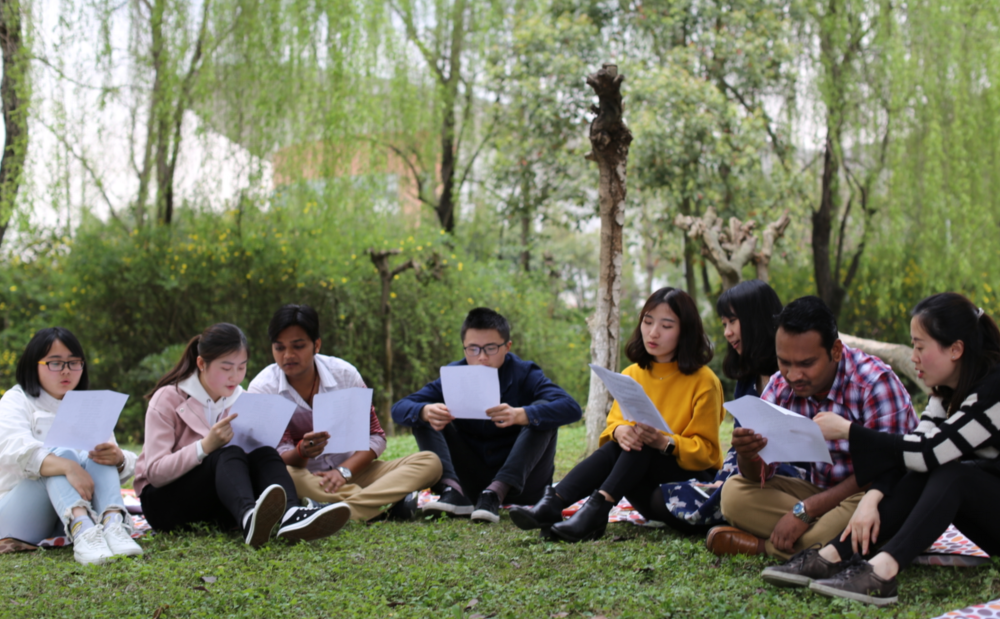 中外师生在草坪上齐聚一堂,背诵唐诗,品尝美食,分享自己学习汉语和英语的经历,共同感受汉语文字内外洋溢的春天气息。体育部胡芳老师作为特邀嘉宾,教授学生学习太极的站姿和坐姿,带领大家体验中国太极的魅力。随后,开展了“谁是卧底”和“你画我猜”的汉字游戏活动。