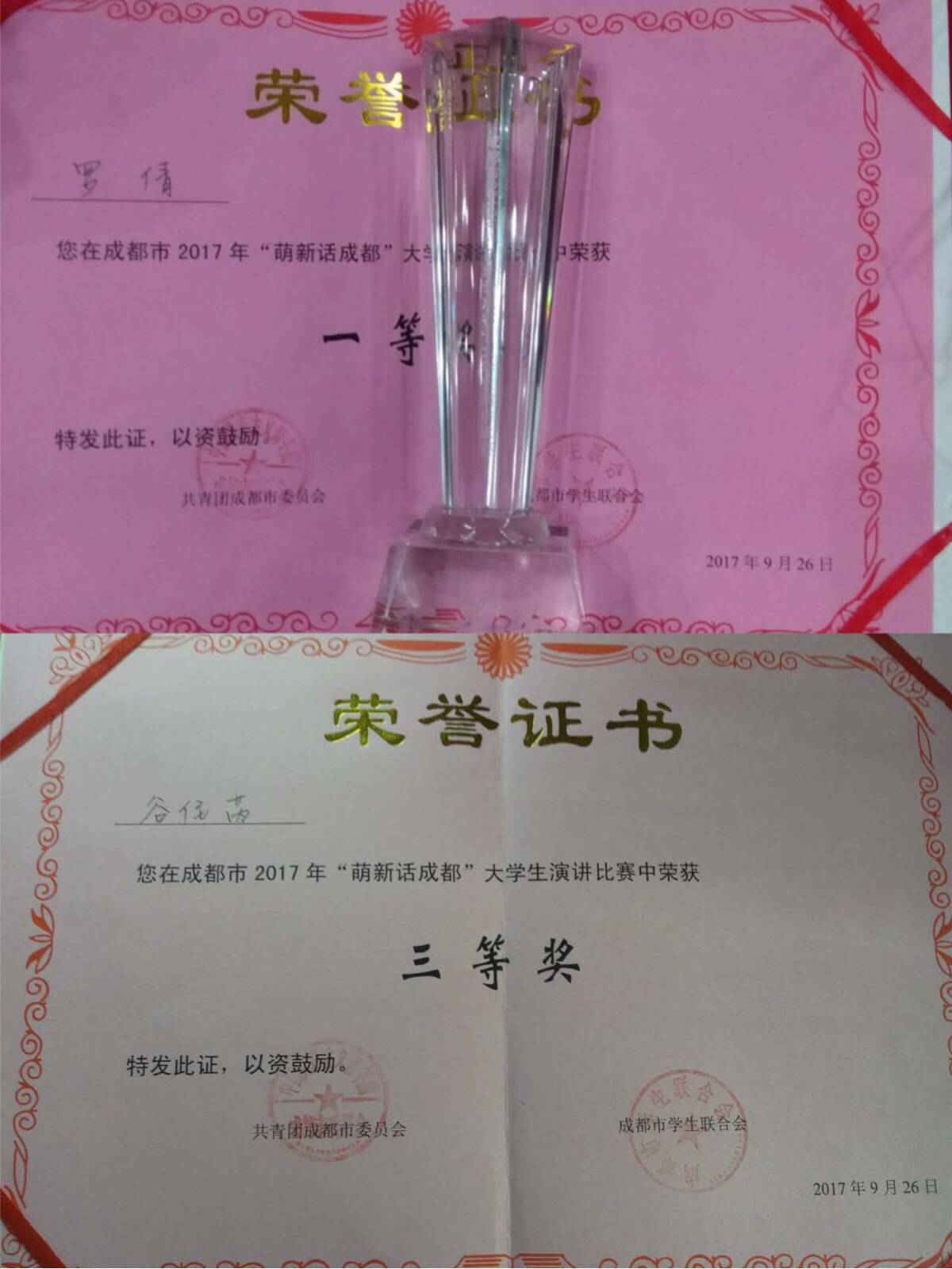 【本网讯】9月26日,由共青团成都市委员会、成都市学生联合会主办,西南交通大学承办的成都市“萌新话成都”大学生演讲比赛在西南交通大学犀浦校区举行。来自四川大学、电子科技大学、成都理工大学、四川师范大学及我校等40余名川内高校选手参加此次决赛。经过激烈角逐,我校选拔推荐的两名同学在决赛中取得优异成绩。