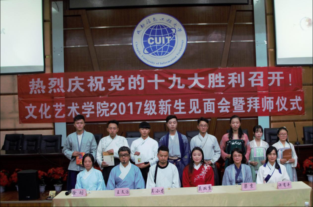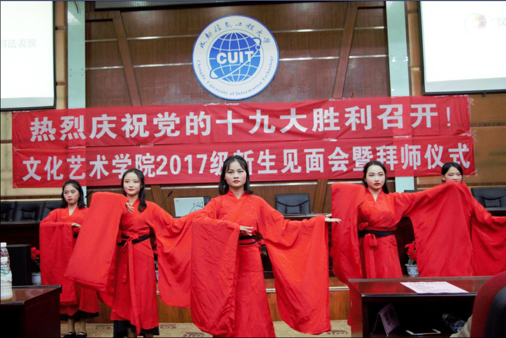 大会紧密围绕“献礼十九大,弘扬中华优秀传统文化”的主题,举行了隆重的拜师仪式,参加仪式的老师和同学们身着汉服。同时,老师与同学们还一起欣赏了汉舞及毛笔字书法表演。中华优秀传统文化的展示掀起了大会的高潮,不仅体现了大学之道的深刻含义,也将中华优秀传统文化得以继承与弘扬,进一步明确了学院人才培养新要求,增强了2017级新生对成信精神的认同感与归属感。