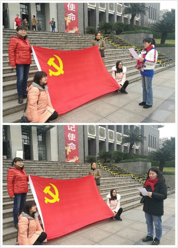 在红岩魂陈列馆前,党员老师集体祭奠红岩英灵、重温入党誓词,教工支部两位老师面对党旗,宣读了《入党志愿书》和《转正申请》。