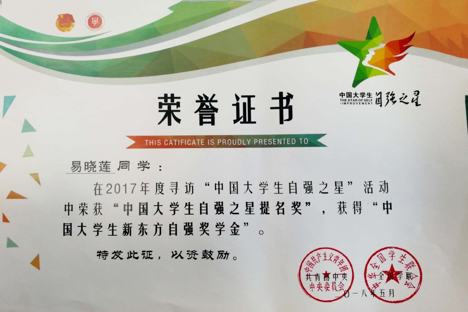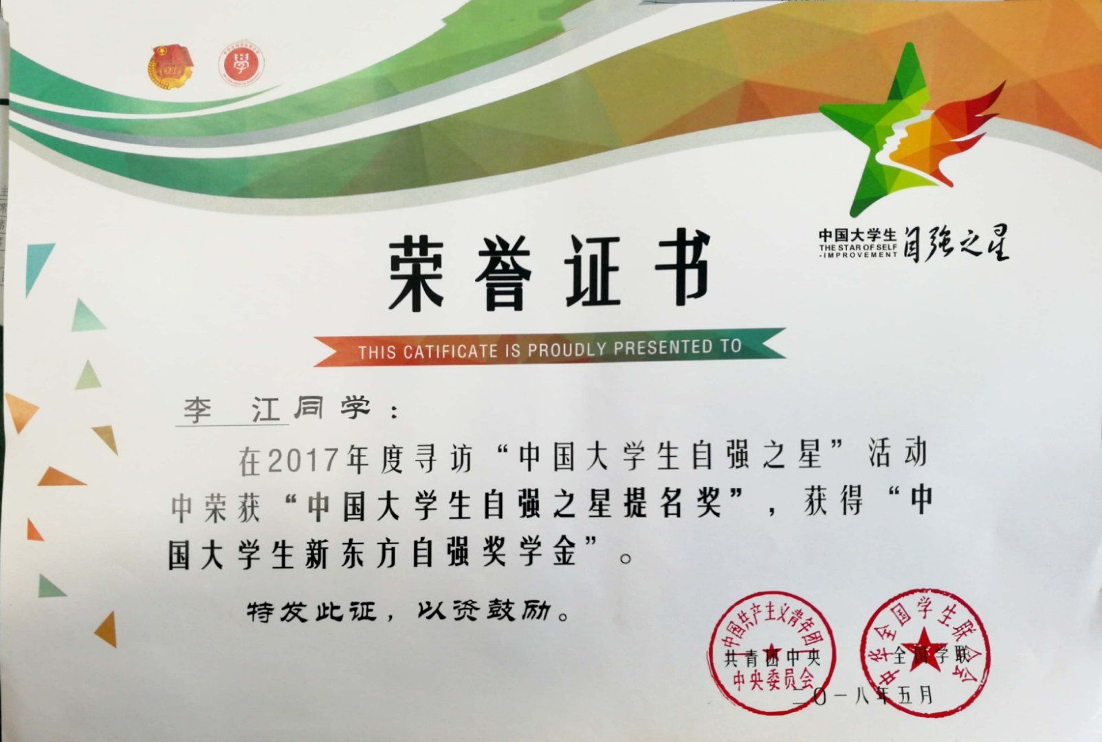 我校学子获得2017年度“中国大学生自强之星”提名奖