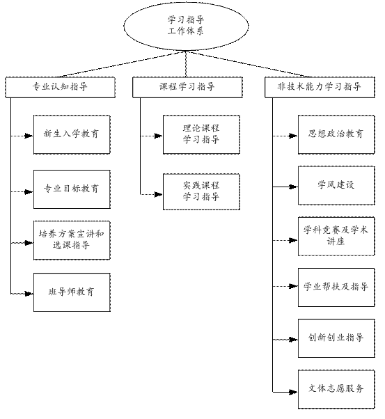 根据人才培养目标,学院对学生学习实行三级指导。即在学院教学指导委员会监督和指导下,建立了系—班—课程三级管理体系,其中“系”级以专业负责人、骨干教师负责;“班”级以班导师、辅导员负责;“课程”级以任课教师负责。与此同时,积极组织学院领导、辅导员、朋辈学生多方位参与学习指导,学院把握学习指导策略方向,专业教师和辅导员负责具体实施和跟踪,班委、学生干部及党员学生积极对学习困难学生进行学习帮扶。